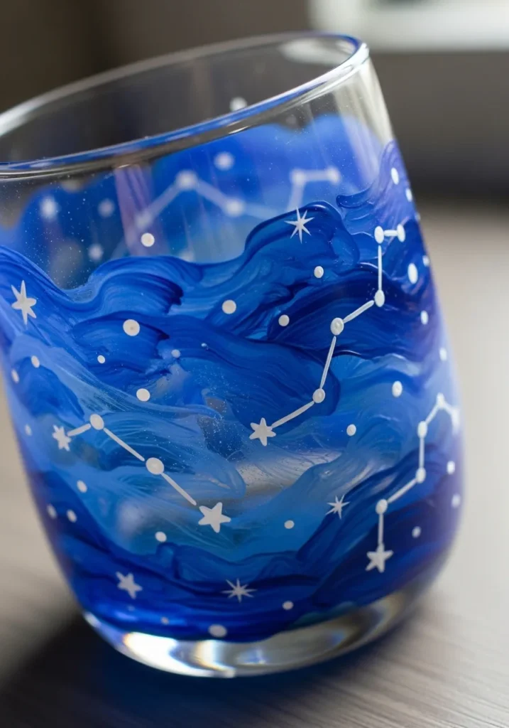If you have a fascination with the stars, this project is a wonderful way to personalize your glassware collection. The swirling blue paint is incredibly fun to apply because you don’t have to worry about being precise to get that ethereal sky look. It is truly rewarding to see the white constellation lines pop against those deep background colors as you finish the design. This would make a thoughtful and mystical gift for a friend who loves astrology.