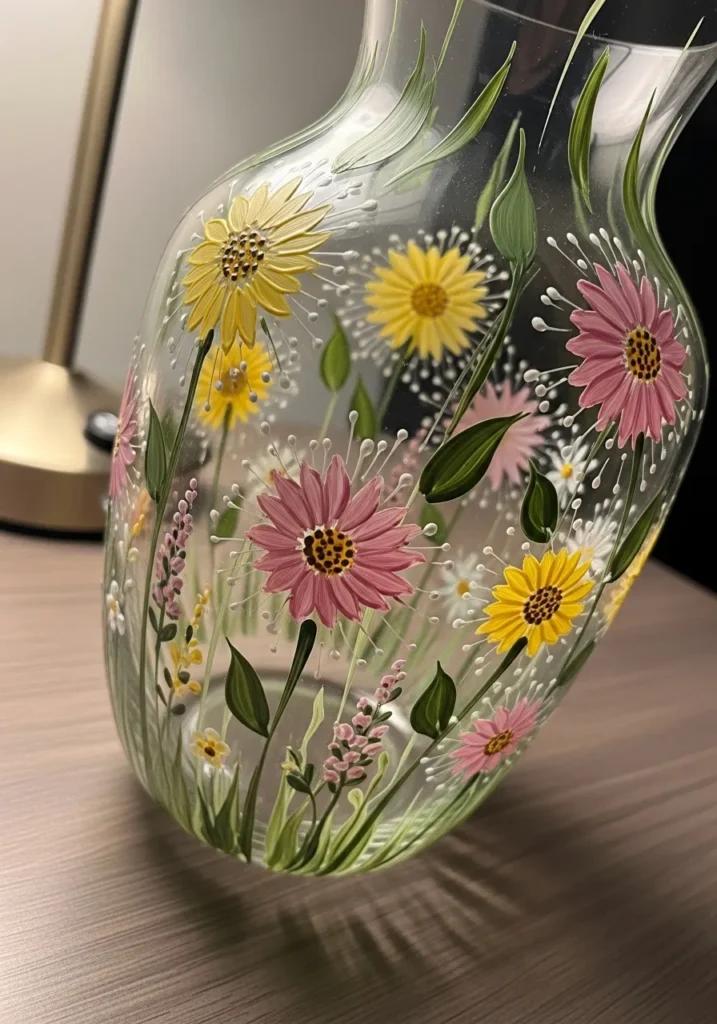 Creating this floral design is such a relaxing way to spend a rainy afternoon. You will find that these blossoms are actually quite easy to master because they rely on simple five-petal shapes that don’t need to be perfect to look stunning. This is a brilliant choice for upcycling a plain water carafe into a gorgeous centerpiece for a brunch table. It feels like bringing a little bit of the outdoors inside with just a few strokes of a brush.