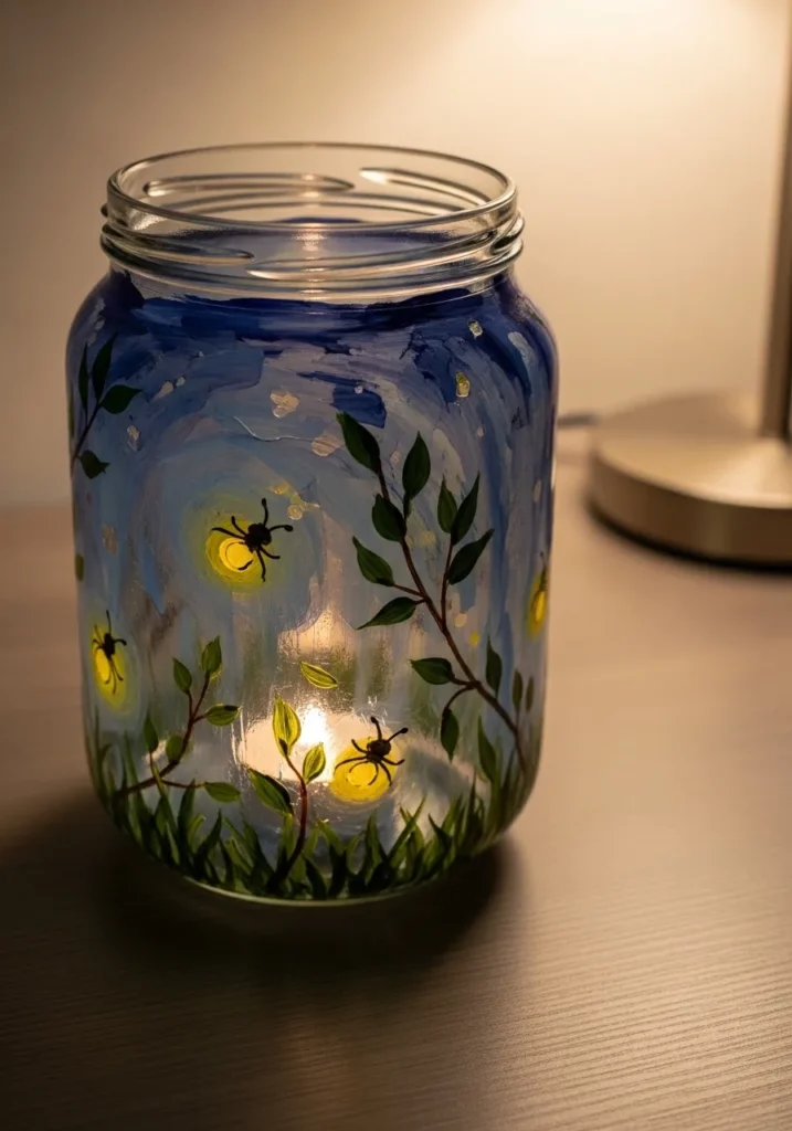I am completely charmed by how the warm light from within makes those painted fireflies actually look like they are flickering in the dark. If you’re into decor that doubles as a mood setter, this project is a total winner because it transforms a plain jar into a soulful piece of art. It is such a clever way to practice blending colors without needing to be super precise, since the blurry halos are what give it that dreamy vibe. Setting a few of these on a patio table would make any evening feel like a special occasion.