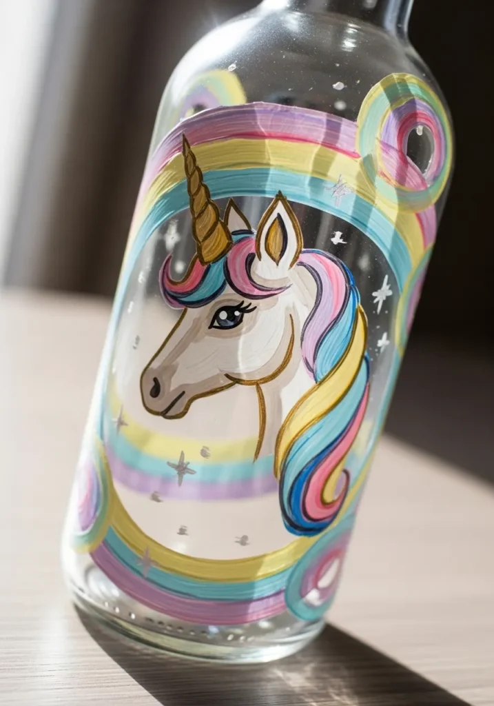 This whimsical bottle showcases a beautifully detailed unicorn surrounded by soft pastel rainbow swirls. The artist chose a creamy palette of mint, lavender, and buttery yellow acrylics to create the flowing mane and the circular background patterns. A touch of metallic gold defines the horn and the elegant outlines, while tiny silver stars add a sprinkle of magic across the clear glass. The smooth application of paint combined with the fine linework on the unicorn’s face gives this piece a polished yet playful character.
