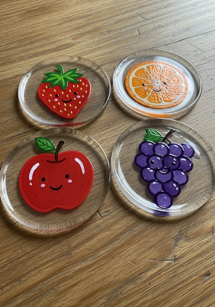 These circular glass coasters feature a set of four vibrant fruit designs, including a strawberry, an orange slice, a red apple, and purple grapes. Each fruit is painted with a glossy opaque finish and given a sweet personality with tiny black eyes and smiling mouths. The bold colors like bright crimson and deep violet contrast beautifully against the clear glass backgrounds, while small white highlights add a 3D effect. The thick, smooth outlines keep each illustration looking sharp and playful.