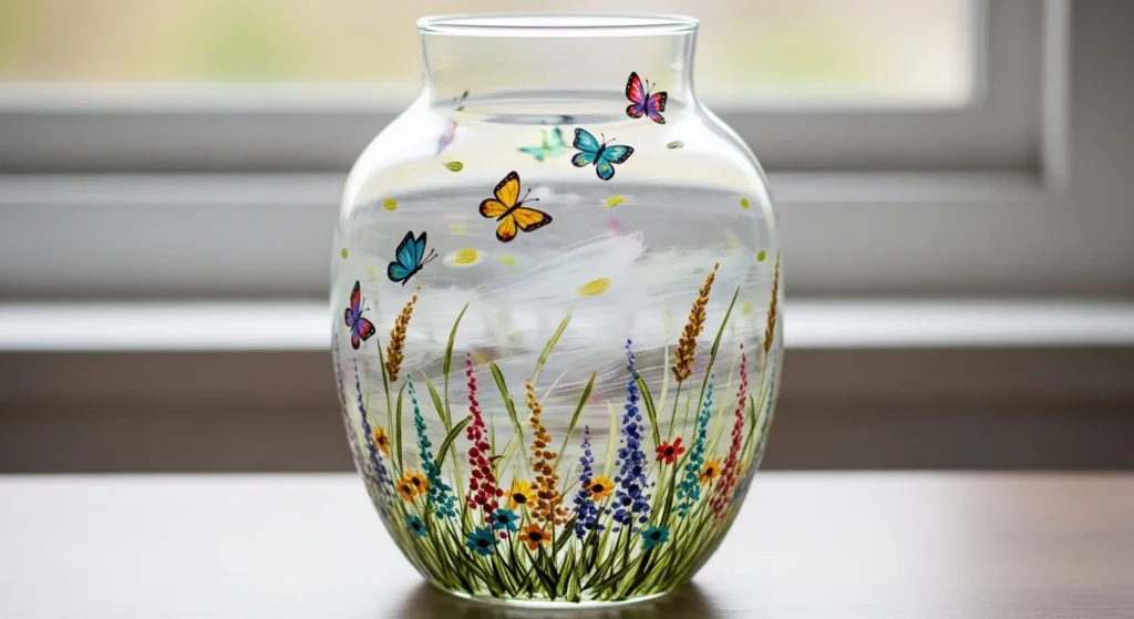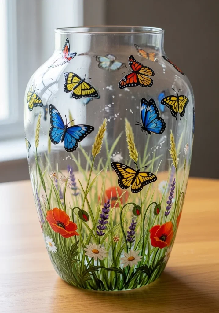 I am completely head over heels for this design because it brings a massive dose of nature’s beauty indoors without needing a green thumb. If you love that cottage garden look but want something that lasts longer than a week, this is your golden ticket. It is surprisingly simple to pull off because you can use individual stickers or stencils for the butterflies if you aren’t feeling confident with a tiny detail brush. I love how the transparent glass makes it feel like you are looking through a window into a secret backyard sanctuary, and it is the kind of project that makes everyone ask where on earth you bought such a gorgeous piece.