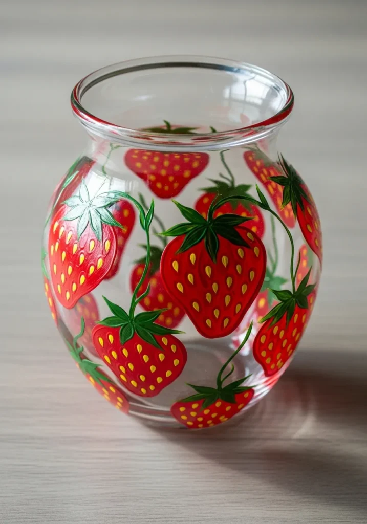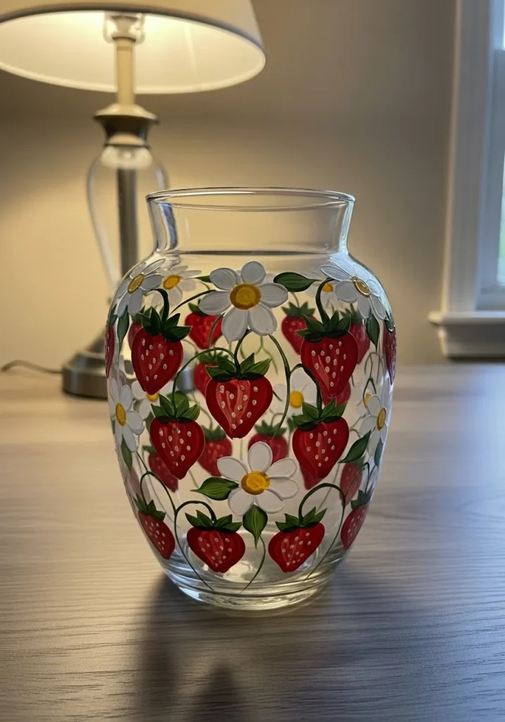 This glass vase is a total sweetheart with its charming combination of fresh fruit and floral blooms. The design features glossy red strawberries adorned with tiny white seeds and topped with crisp green leaves. Interspersed among the berries are cheerful white daisies with bright yellow centers that give the whole piece a classic cottage garden feel. Delicate green vines swirl across the transparent glass to connect the different elements, creating a sense of movement and natural growth. The paint is applied with a smooth and opaque finish that makes every individual berry and petal stand out beautifully against the clear background.