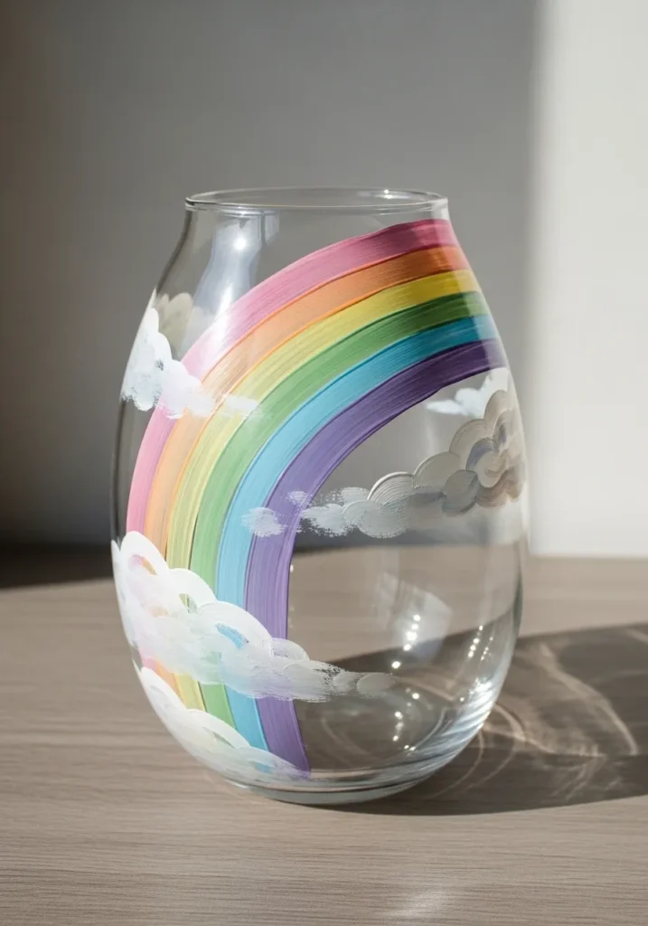 I think this project is a total winner because it is so incredibly cheerful without being too loud or overwhelming. If you’re looking for a way to add a bit of “happy” to your desk or bedside table, this pastel rainbow is exactly the right vibe. It is also one of the easiest designs to master since you can just follow the natural curve of the vase and let your brush do all the work. There is something so satisfying about watching those colors blend on the glass, and honestly, you can’t help but smile every time you look at it.