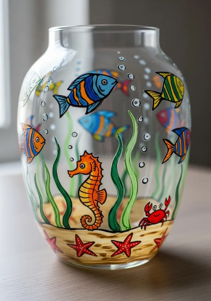 This whimsical glass vase brings the hidden wonders of the ocean floor to life with a stunningly detailed coral reef scene. At the heart of the design stands a magnificent orange and yellow seahorse with a beautifully spiraled tail nestled among swaying stalks of lime green seaweed. Schools of tropical fish in striking patterns of blue, orange, and sunshine yellow swim through the clear glass water while a sandy textured seabed anchors the design with red starfish and a tiny crimson crab. Every creature is finished with a sharp black outline and tiny white bubble accents that create a sense of depth and playful movement within the transparent glass.