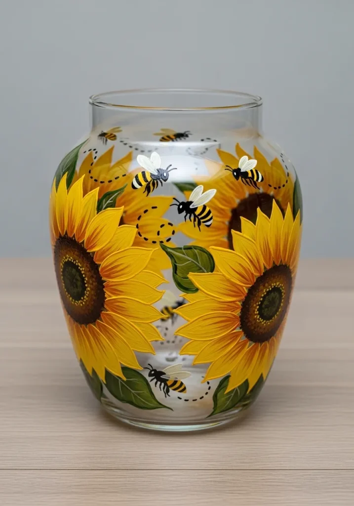 This stunning glass vase celebrates the height of summer with its bold and cheerful botanical display. Massive sunflowers with velvety chocolate centers and layers of bright ochre petals wrap around the vessel, creating a high-impact floral pattern. The paint is applied with thick, impasto-like strokes that give the sunflower heads a realistic, raised texture you can almost feel. To bring the scene to life, adorable fuzzy honeybees with delicate white wings and black-and-yellow stripes zig-zag between the blooms, leaving behind whimsical dotted flight trails that add a sense of playful movement to the transparent glass.
