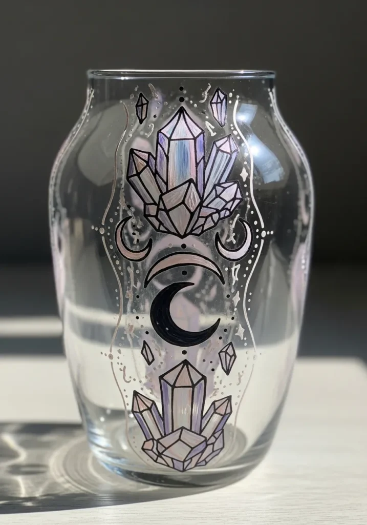 This enchanting glass vase looks like it belongs in a high-end crystal shop or on a magical altar. The design features vertically stacked amethyst clusters painted with shimmering lavender, soft pink, and cool blue highlights to mimic the natural facets of a gemstone. Bold black crescent moons in various phases are nestled between the crystal points, creating a perfect symmetrical balance on the clear glass. Delicate silver linework and tiny white dots frame the central motif, adding a celestial sparkle that catches the light beautifully from every angle.