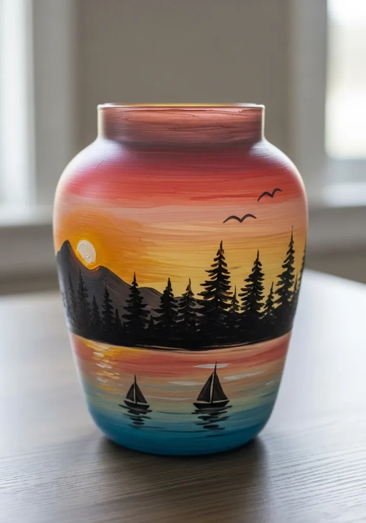 I think this is the perfect grand finale for your painting project because it really shows off how you can use a vase as a 360-degree canvas for a full landscape. If you find detailed flower petals a bit finicky, you will love working with these broader strokes to blend that gorgeous sky. It is such a rewarding way to capture your favorite vacation memory or just a peaceful moment from nature. The frosted texture of the glass gives the whole scene a soft and professional glow that makes it look like a high-end piece of gallery art.