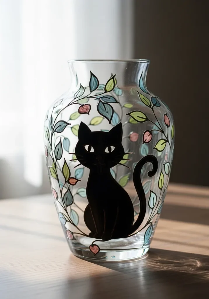 This elegant, clear glass vase features a bold black silhouette of a sitting cat as the stunning centerpiece. The cat is painted with a smooth, glossy finish that really pops against the delicate background of winding vines and soft teardrop leaves. These botanical accents are filled with a dreamy palette of dusty rose and muted teal, which creates a sophisticated contrast against the deep black of the feline figure. The clean lines of the design give the whole piece a modern yet whimsical feel that is perfect for anyone who loves a bit of artistic flair in their home.