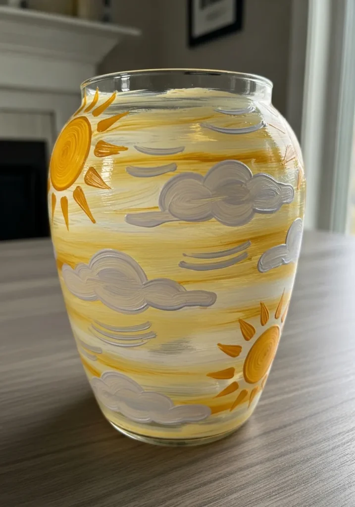 I think this project is a total joy to work on because it is basically impossible to feel gloomy while you are painting little suns. If you’re looking for a way to brighten up a dark corner or a windowless shelf, this sunny design is your best friend. You don’t need to be a professional artist to get those fluffy cloud shapes right since they are naturally irregular and very forgiving. It feels like you are bottling up a perfect summer afternoon, and honestly, we all need a little more of that glow in our lives.