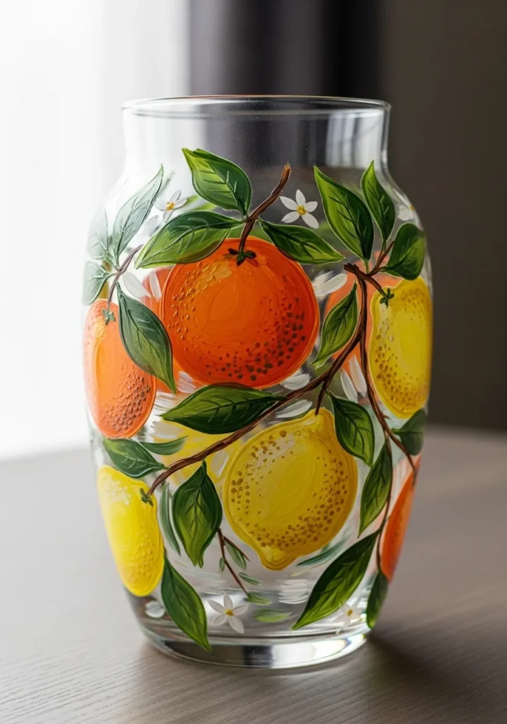 This vibrant glass vase brings a slice of the sunny Italian coast to your home with its stunning citrus branch design. The artwork features plump oranges and lemons painted in bold shades of tangerine and lemon yellow with tiny dark dots for that realistic rind texture. Lush emerald leaves with delicate veining curve gracefully around the fruit, while small white blossoms add a sweet and airy touch to the composition. Everything is set against a crystal-clear glass background, which allows the rich colors to glow beautifully when the light hits them.