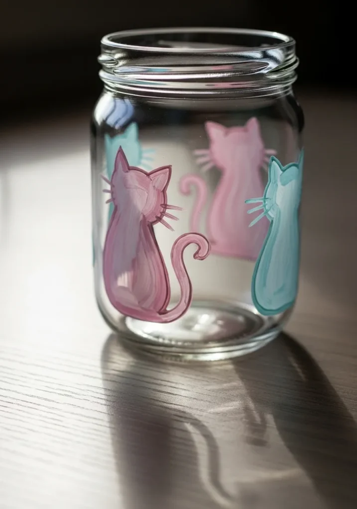 This adorable glass jar features simple yet sweet cat silhouettes painted in soft pastel pink and mint blue. The artist used translucent glass paints that allow the light to filter through, making the kitties almost glow when the sun hits them. Each feline shape is defined by a slightly darker outline, giving the design a clean and polished look without being overly complicated. It is a wonderful example of how basic shapes and a limited color palette can turn a plain storage jar into a piece of functional art.