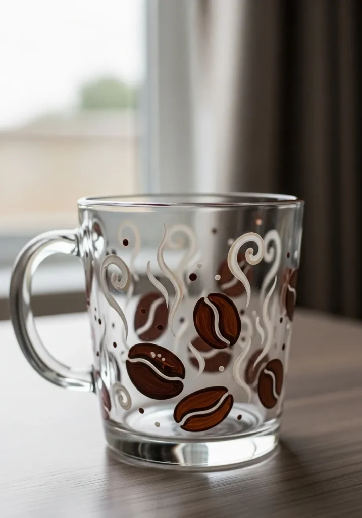This clear glass mug includes a charming hand-painted design of roasted coffee beans and wispy steam swirls. The beans are rendered in rich chocolate brown with creamy white highlights to show off their texture, while the steam is painted in elegant off-white curls that wrap around the glass. Small brown and tan dots are scattered between the main elements, adding a balanced and professional look to the overall pattern. It is a lovely example of a themed craft that is both functional and decorative for your morning routine.