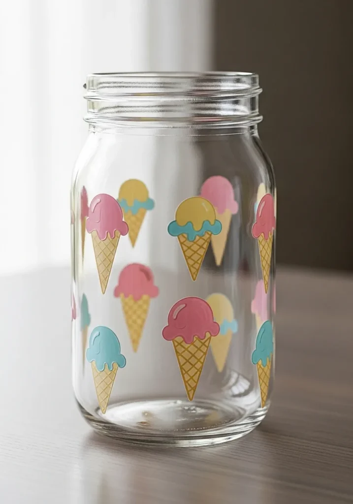 This clear mason jar features a sweet pattern of hand-painted ice cream cones in soft pastel pink, blue, and yellow. Each scoop sits atop a tan waffle cone detailed with a simple crisscross pattern, giving the design a nostalgic and playful feel. The artist used opaque paints with a glossy finish, making the tiny treats stand out clearly against the transparent glass. It is a lighthearted design that relies on clean outlines and cheerful colors to create a cohesive, summery look.