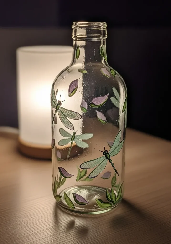 I love how painting dragonflies lets me practice graceful, thin strokes in a relaxed way. If you are looking for a project that feels light and elegant, this garden-themed design is an excellent choice for your first bottle makeover. It is a really therapeutic way to spend your creative time, and the finished piece looks stunning when placed near a sunny window where the light can catch those delicate wings.