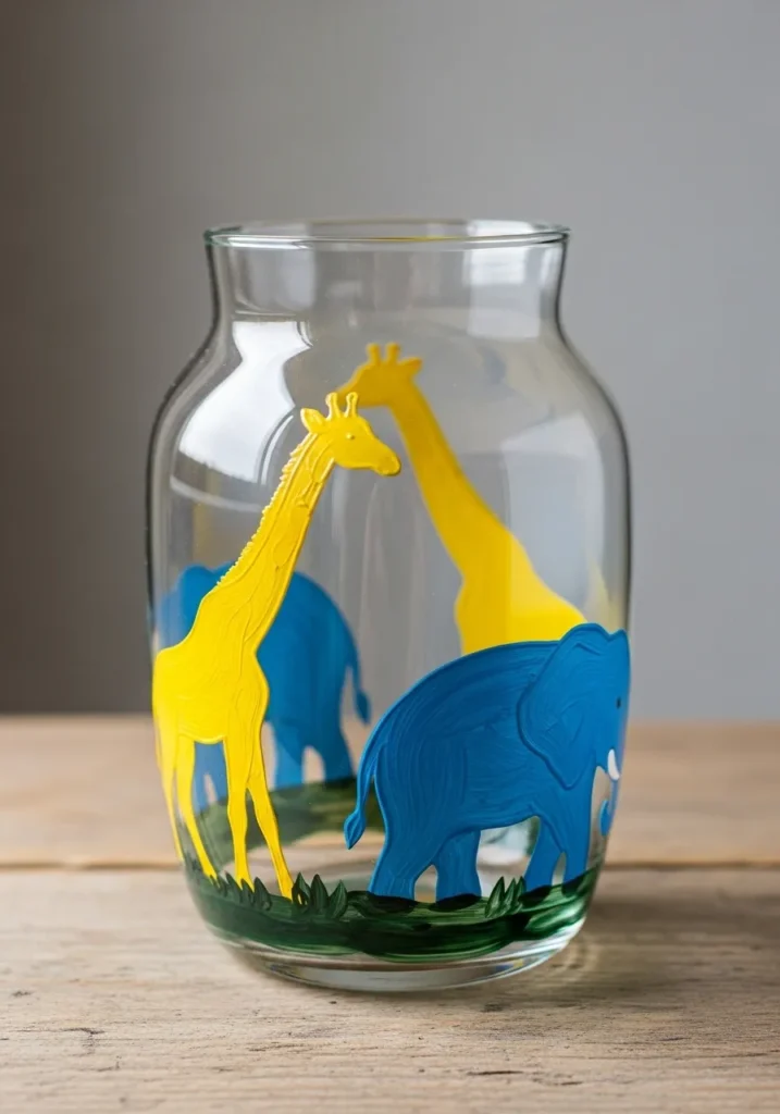 Choosing large, solid shapes like these is a smart way to practice paint control without getting bogged down in tiny details. These vibrant primary colors make the project feel energetic and are perfect for a kid’s room or a playful shelf accent. It is a quick and effective way to turn a basic vase into a custom piece of safari-themed decor.