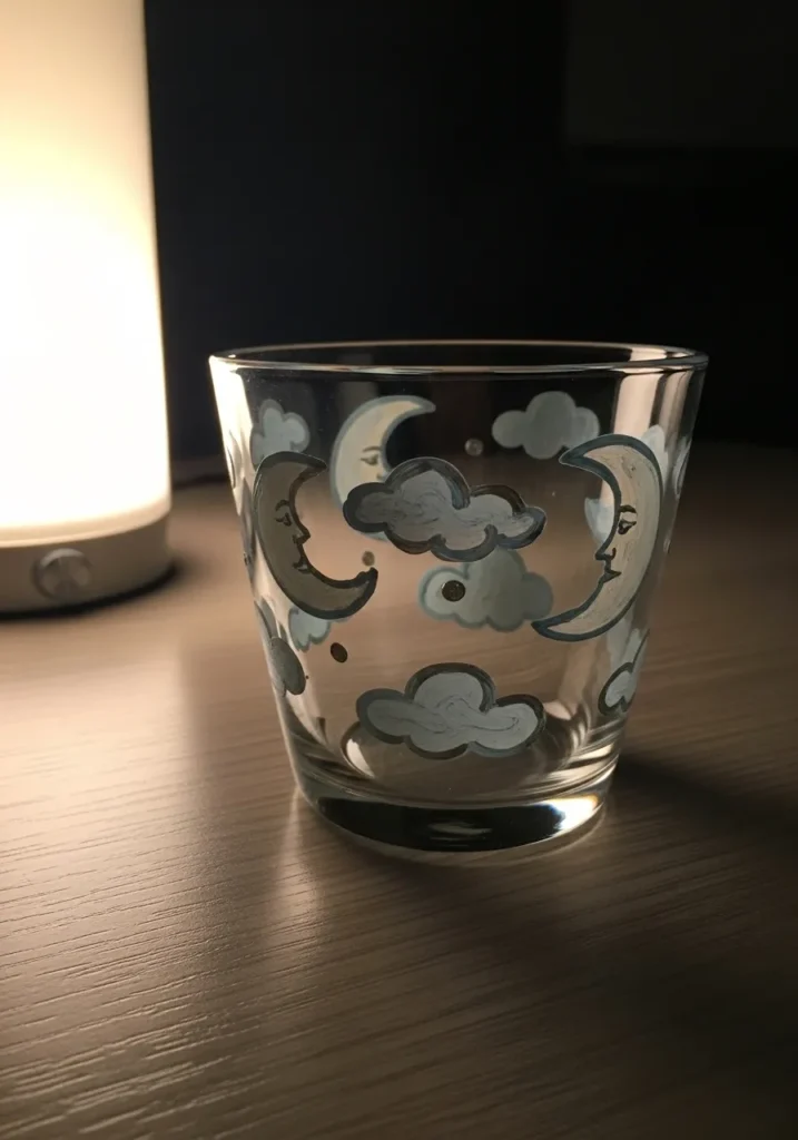 This clear glass cup features a serene night sky design with crescent moons and fluffy clouds. Each moon is painted with a peaceful resting face, while the light blue clouds are outlined in a darker teal to help them stand out against the transparency of the glass. Small silver dots are scattered throughout the scene, mimicking distant stars and adding a subtle metallic shimmer. The soft, rounded shapes and cool color palette give the piece a calm and dreamy quality that is perfect for a bedside water glass.