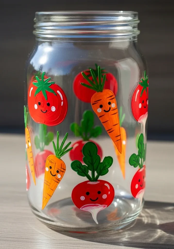 This clear mason jar features an adorable hand-painted pattern of smiling vegetables, including plump red tomatoes, bright orange carrots, and rosy radishes. The artist used vibrant, opaque paints to create the cheerful faces and lush green stems, giving each veggie a unique personality. The glossy finish of the paint stands out beautifully against the transparent glass, creating a clean and professional look that is perfect for any kitchen setting.