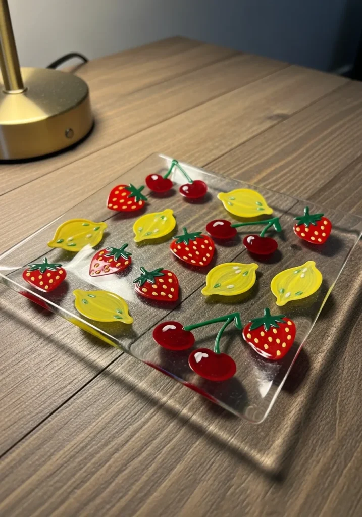 This square glass tray is decorated with a cheerful pattern of hand-painted strawberries, lemons, and cherries. The tiny fruits are rendered in glossy reds and yellows, featuring small white accents that mimic highlights and little seeds. Each piece of fruit is spaced out evenly across the clear surface, creating a repetitive motif that feels both modern and nostalgic. The smooth texture of the paint adds a slight dimension to the glass, making the whole design pop with a fresh and juicy energy.