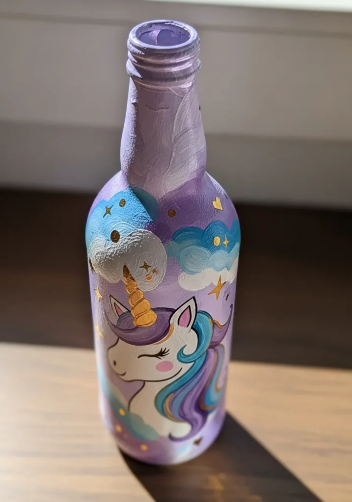 I am a big believer in using upcycled bottles for practice because it takes the pressure off, since you are starting with something from the recycling bin anyway. If you’re into fantasy themes, this project is a wonderful way to play with blending different colors in the unicorn’s mane without needing a perfectly steady hand for the background. It is such a rewarding craft for beginners because the result looks like a professional decorative piece for a nursery or a bedroom bookshelf.