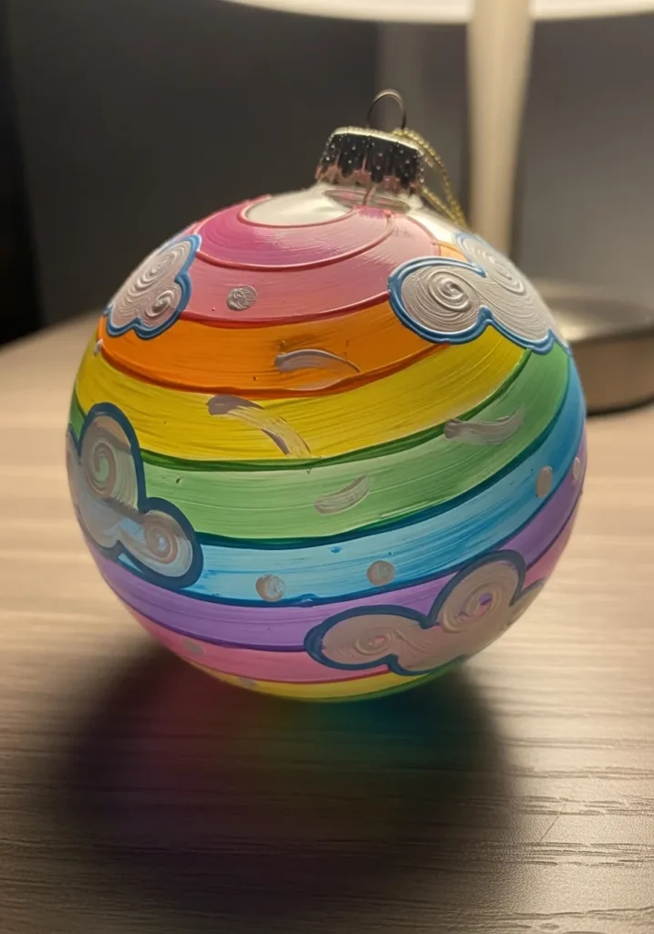 This glass ornament is wrapped in vibrant, horizontal stripes of pink, orange, yellow, green, and purple. Several fluffy white clouds with blue outlines are scattered across the colorful background, featuring swirling textures that add a sense of movement. The paint is applied in thick, visible layers that give the sphere a playful and tactile quality. Small silver dots are tucked between the bands of color, providing a subtle hint of sparkle that mimics falling rain or distant stars.