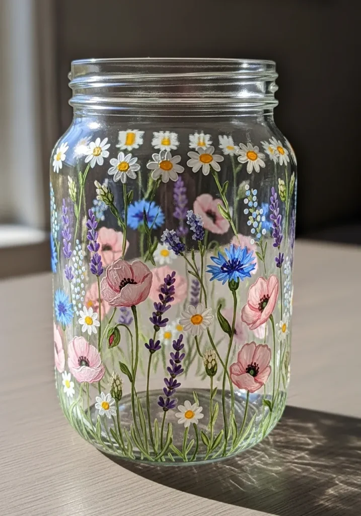 This jar keeps the glass crystal clear to let the beautiful hand-painted details really pop. Vibrant pink poppies and deep purple lavender stems grow up from the base in a lush meadow scene. The artist used delicate white daisies and bright blue cornflowers to fill in the gaps with fine green leaves connecting everything. You can see the slight texture of the acrylic paint on the surface, which gives it a lovely handcrafted dimension.
