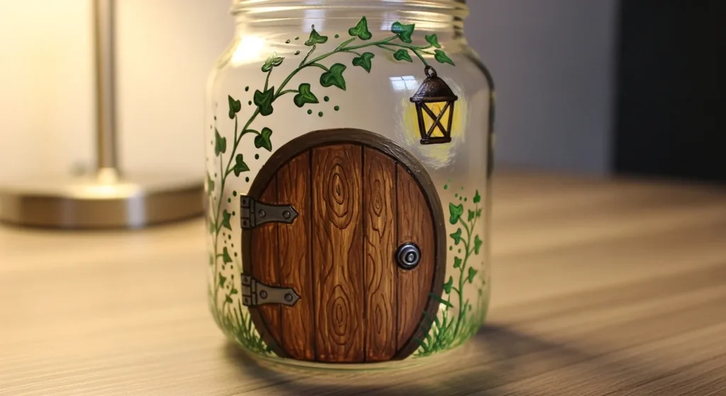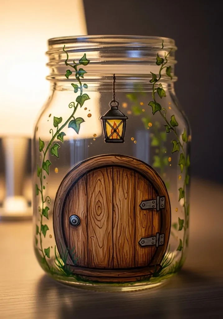 This whimsical jar features a detailed hand-painted wooden door that looks like it belongs in a magical forest. The wood grain texture is rendered in warm oak tones with tiny silver hinges and a round doorknob for a realistic touch. Climbing ivy vines in various shades of emerald and lime green frame the door, while a cute little lantern hangs just above the entrance. Tiny gold dots are scattered around the clear glass to represent flickering fireflies or magical dust in the air.