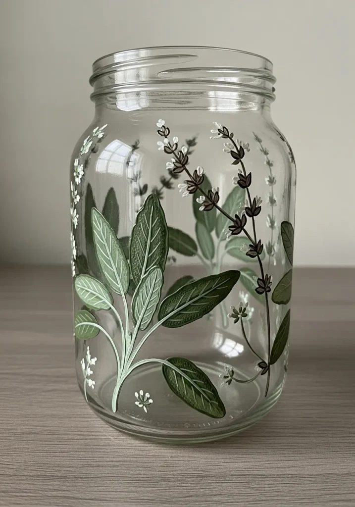 This jar keeps things classy and minimal with a focus on realistic herbal illustrations. Large sage leaves in various shades of muted olive and dusty green wrap around the base with fine white veining details. Tall stems of budding flowers in dark charcoal and crisp white extend toward the rim of the jar. The paint has a thick, raised texture that makes the leaves look like they are actually growing right out of the glass surface.