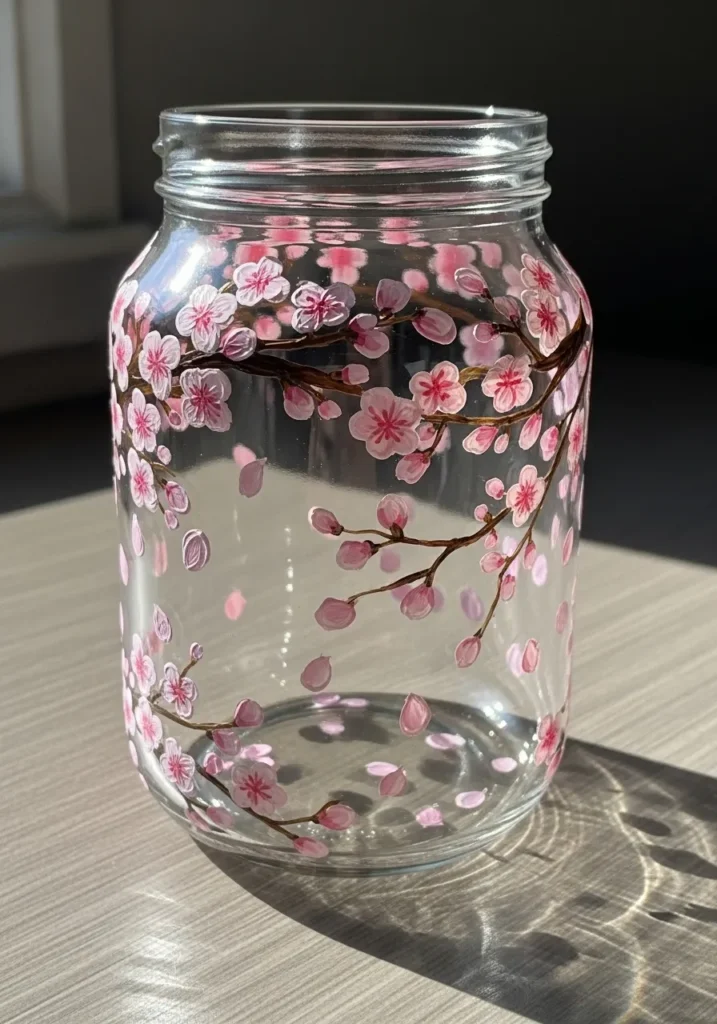 This jar features delicate pink cherry blossoms painted along slender dark brown branches that curve gracefully around the glass. The petals use a mix of soft blush and vibrant magenta to create a realistic layered effect that looks like a spring morning. Some petals are even painted as if they are floating down the side of the jar to add a sense of movement. The clear glass background keeps the design feeling light and airy, while the glossy paint finish adds a professional touch.