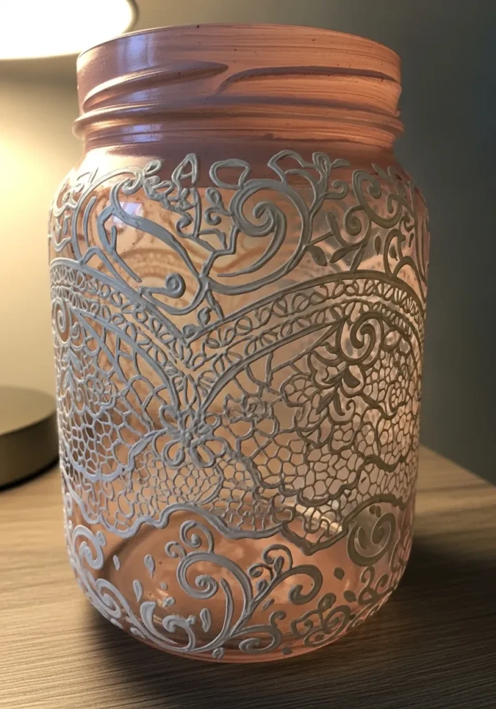 This stunning piece features an intricate lace pattern hand-painted in a crisp white relief style over a soft peachy pink-tinted glass. The design is full of swirling flourishes and delicate floral net patterns that mimic the look of expensive vintage fabric. The white paint is applied with a thick consistency to create a raised 3D effect that you can actually feel when you touch the jar. It has a beautiful matte finish that contrasts perfectly with the translucent glowing quality of the colored glass.