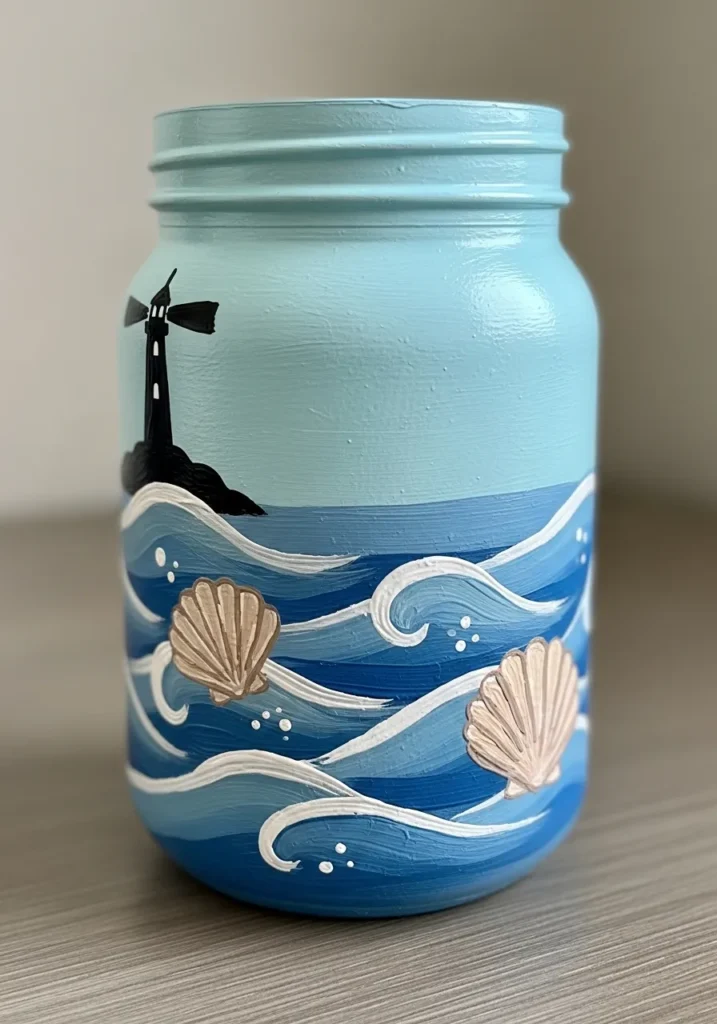 This jar is completely transformed with a solid matte sky blue base that covers the glass from top to bottom. The lower half features dynamic swirling waves in deep navy and bright cerulean with white foam caps that add a sense of crashing water. A solitary black lighthouse stands tall on a dark rocky outcrop while textured tan seashells are nestled among the painted spray. The paint is applied in thick strokes to give the ocean a tactile three-dimensional feel that really brings the seaside theme to life.