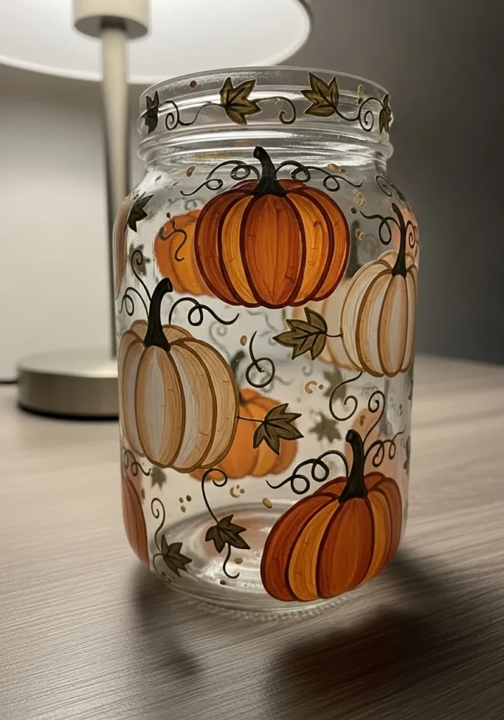This jar celebrates the cozy vibes of autumn with large plump pumpkins painted in shades of burnt orange and creamy white. Each pumpkin features fine brown vertical lines to create depth and a realistic ribbed texture on the clear glass. Elegant black vine swirls and, olive green maple leaves wrap around the fruit, while a delicate leaf border circles the rim. The paint has a smooth semi-gloss finish that makes the colors pop beautifully against the transparent background.