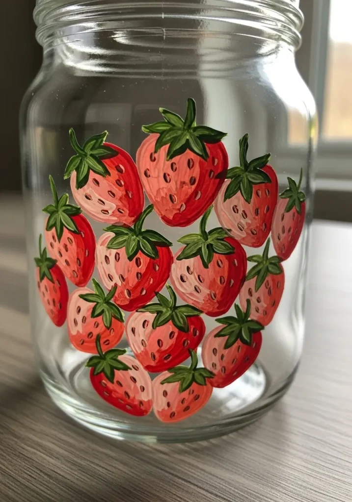 This adorable clear glass jar features a cluster of hand-painted strawberries that look good enough to eat. The design uses vibrant shades of crimson and soft pink for the fruit bodies, while deep forest green creates those cute little leafy tops. Small black dots represent the seeds, which add a nice bit of texture to the smooth glass surface. It is a simple yet effective way to brighten up a plain kitchen container using basic acrylic paints.