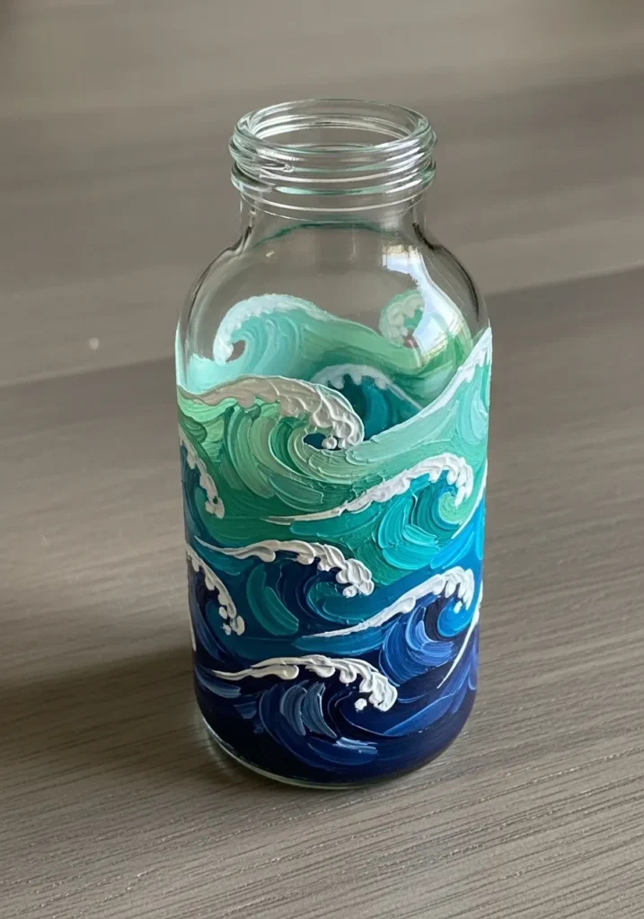 I like using texture to make a simple glass project look more expensive and sophisticated. The beauty of painting waves is that you do not need a steady hand for precise lines because the more organic and messy the strokes, the more realistic the water looks. It is a fantastic way to experiment with color blending and “sculpting” with paint to create a piece that people will definitely want to touch.