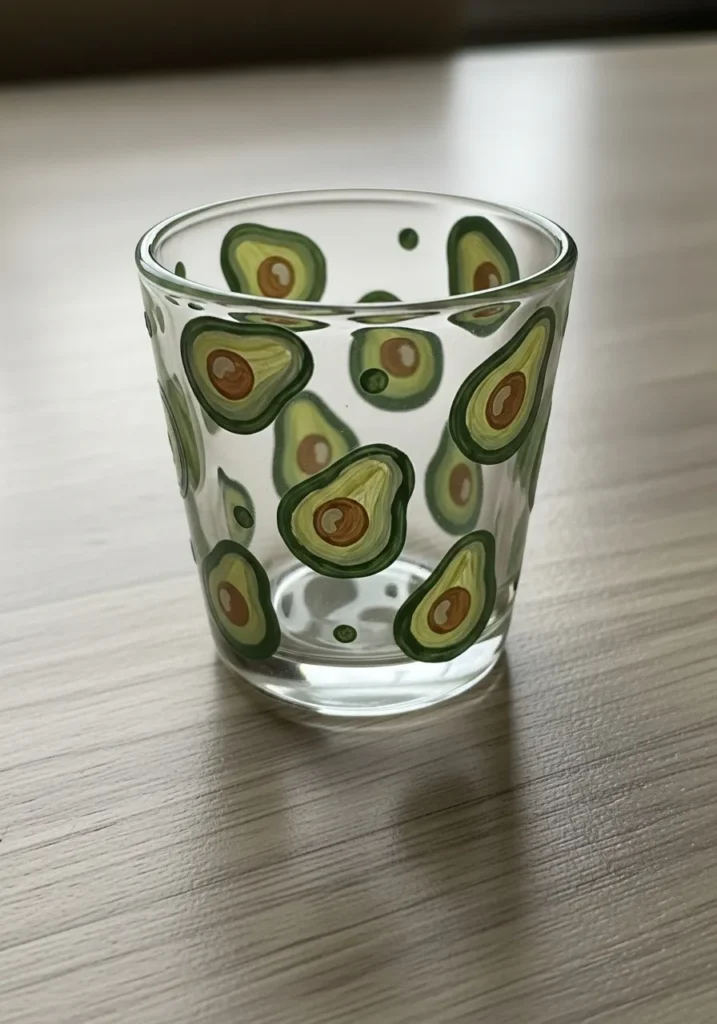 This miniature, clear glass is scattered with the cutest hand-painted avocado halves. The design uses a dark forest green for the outer skin and a creamy lime shade for the soft inside of the fruit. A warm brown circle sits right in the center of each one to represent the pit, while small green dots fill in the empty spaces on the glass. It is a trendy and minimalist look that brings a fun personality to a simple shot glass or small tea light holder.