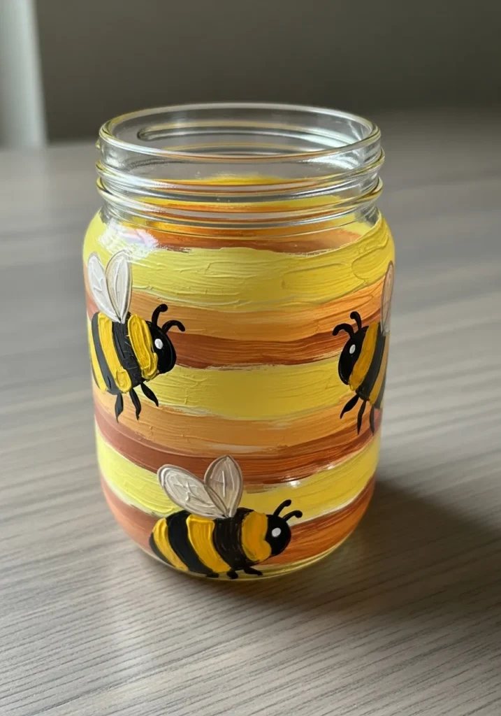 These cheerful little bees are such a fun way to bring a garden vibe indoors. It is a fantastic project for testing out layering techniques since you can let the stripes dry before adding your buzzing friends on top. This jar would look absolutely adorable holding honey sticks or even some dried wildflowers on a windowsill.
