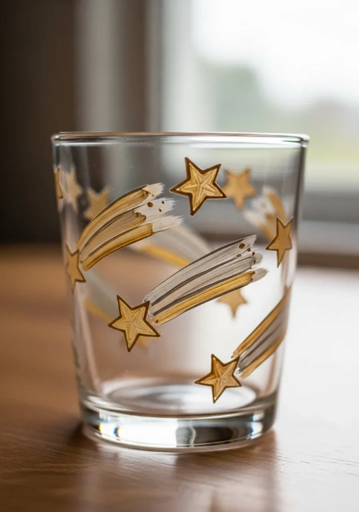In my opinion, this project is a wonderful way to play with metallic paints because they catch the light so beautifully on clear glass. You can really have fun with the streaky brushstrokes for the star trails since they do not need to be perfect to look fast and energetic. It is such a clever way to dress up an ordinary set of glasses for a celebration or just to make your morning water feel a bit more special.