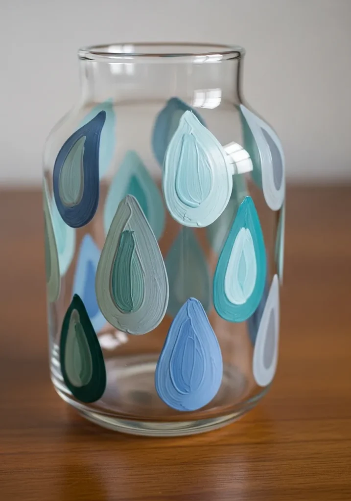 This modern glass vase highlights a collection of large hand-painted raindrops in a soothing palette of blues and greens. The design uses thick impasto-style acrylics that leave beautiful visible ridges and texture on each droplet. Shades of teal, sky blue, and deep forest green overlap slightly on the clear surface to create a cool and refreshing visual effect. It is a fantastic example of using simple geometric shapes to make a bold statement on a plain glass container.