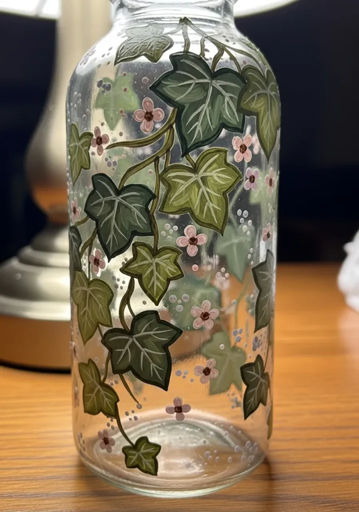 I love how this adds a subtle outdoor feel to a dining table or bedside. The beauty of painting vines is that they can grow and twist in any direction, making it a very forgiving design for those who might be nervous about perfect symmetry. You can start with the main stems and slowly add leaves and flowers until your glass piece looks like it was plucked straight from a cottage garden.