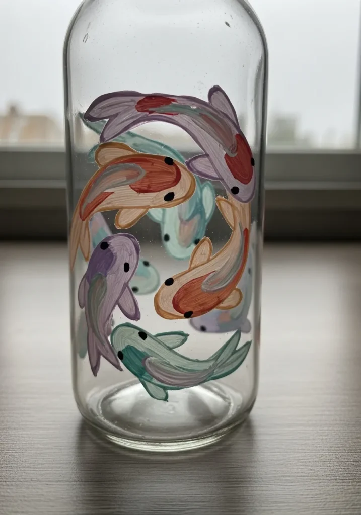 This project includes a clear glass bottle decorated with a circle of swimming koi fish in soft pastel shades. The artist used acrylic paints in muted teal, dusty purple, and warm peach to create a serene underwater feel. Each fish has simple black dot eyes and visible brushstrokes that give the scales a lovely textured appearance as they overlap around the center of the jar.