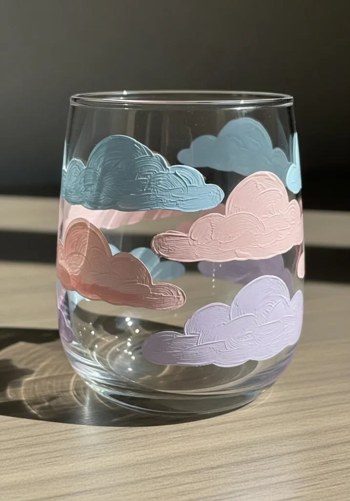 Some people love a project that is all about the “feel” of the paint, and this design is exactly that. I am a huge fan of how the thick brushstrokes catch the light, turning a simple drinking glass into something that feels like a tiny piece of modern art. It is an incredibly easy look to achieve because there are no strict lines to follow, so you can just focus on swirling the paint around until your clouds look perfectly puffy.