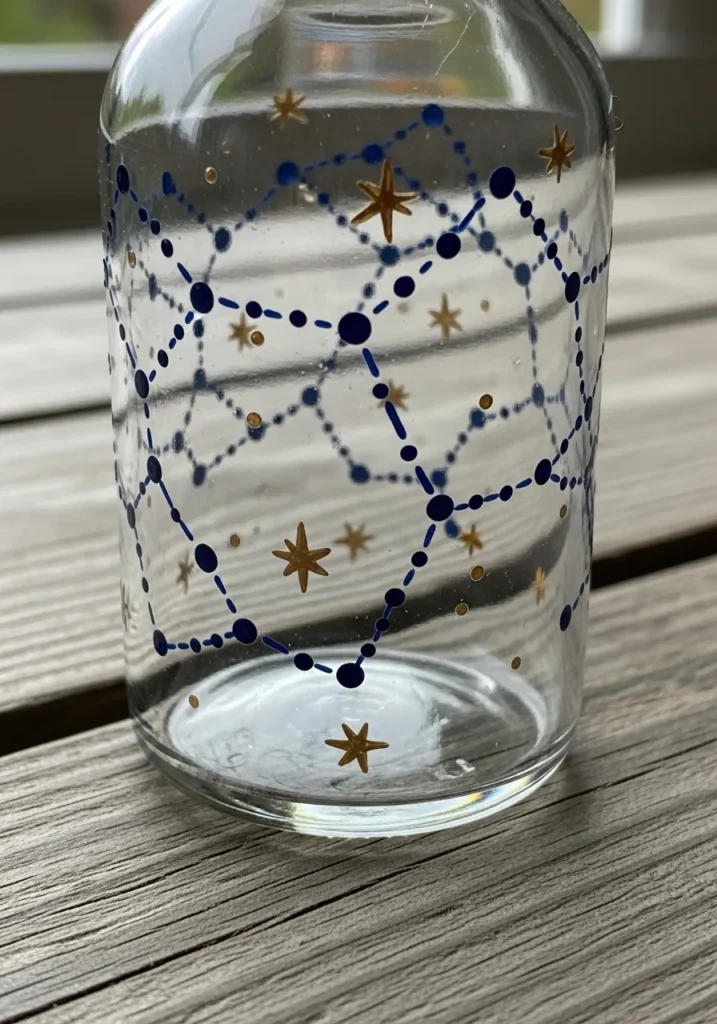 This clear glass bottle showcases a delicate hand-painted constellation map that wraps around the entire surface. The design uses a deep navy blue for the connecting lines and larger circular nodes, while shimmering metallic gold stars are scattered throughout. Each tiny dot and line is meticulously placed to create a celestial pattern that looks elegant against the transparency of the glass. It is a sophisticated way to add a touch of the night sky to your home decor using simple dotting techniques.