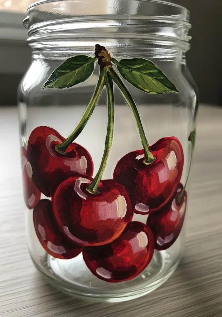 I am convinced that cherries are the ultimate beginner-friendly motif because you can get away with slightly imperfect circles while still looking like a pro. These little pops of red instantly brighten up a kitchen shelf or a workspace when you use the jar as a brush holder. It is a quick afternoon project that yields a high-impact result without requiring complex sketching.