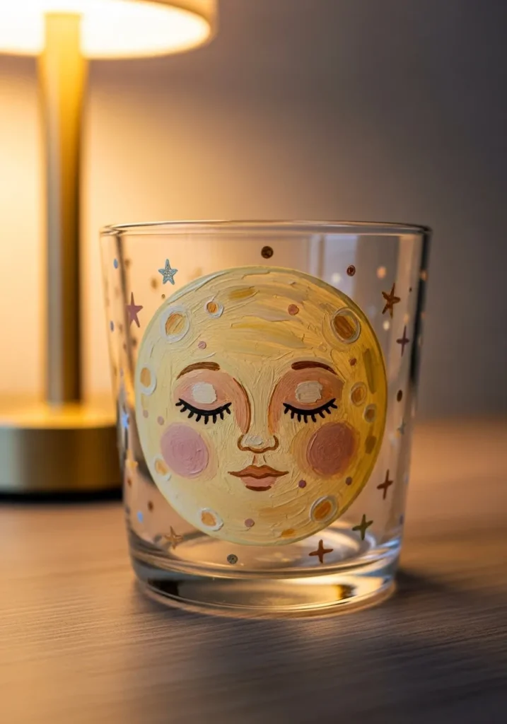 If you enjoy projects with a bit of a whimsical vibe, this celestial design is such a creative choice to try out. You can really play around with the different shades of yellow to create depth, and those tiny stars are surprisingly easy to dot on using the end of a paintbrush. It is the perfect way to turn a plain drinking glass into a bedside treasure that feels both cozy and artistic.