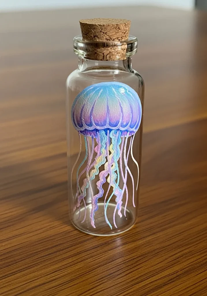 This tiny glass vial showcases a beautifully detailed jellyfish painted in iridescent shades of violet, sky blue, and soft pink. The artist used fine liners and thin acrylic washes to create the delicate, trailing tentacles that seem to float inside the clear glass space. A cork stopper adds a rustic touch to the overall design, contrasting perfectly with the ethereal, glowing texture of the sea creature.