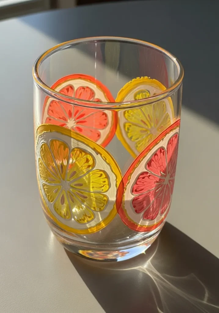 I am always looking for ways to make my glassware stand out, and these citrus slices are such a breeze to create. You just have to paint a simple circle and then divide it into triangles for a look that is both modern and playful. It is a fantastic way to experiment with layering different shades of the same color to make the fruit look incredibly realistic and fresh.