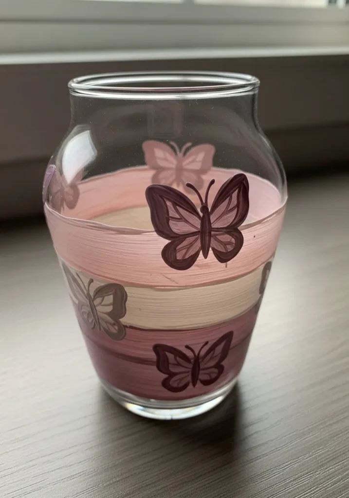 This glass vase features a chic banded design with horizontal stripes in shades of dusty rose, cream, and deep plum. Delicate butterflies are painted over the stripes in a matching dark mauve, using fine lines to define their wings and antennae. The thick, visible brushstrokes on the background stripes give the piece a handcrafted, rustic feel that contrasts beautifully with the smooth glass surface.
