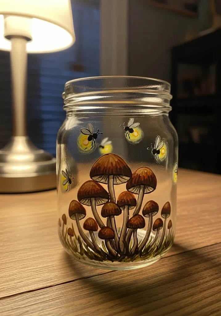 This enchanting glass jar brings a touch of forest magic to your desk with its hand-painted cluster of mushrooms and glowing fireflies. The artist used earthy brown and tan shades for the mushroom caps, adding fine lines to suggest texture on the stems and undersides. Floating above the fungi are tiny black fireflies with bright yellow halos that create a beautiful glowing effect against the clear glass. It is a whimsical design that combines rustic nature vibes with a hint of fantasy.