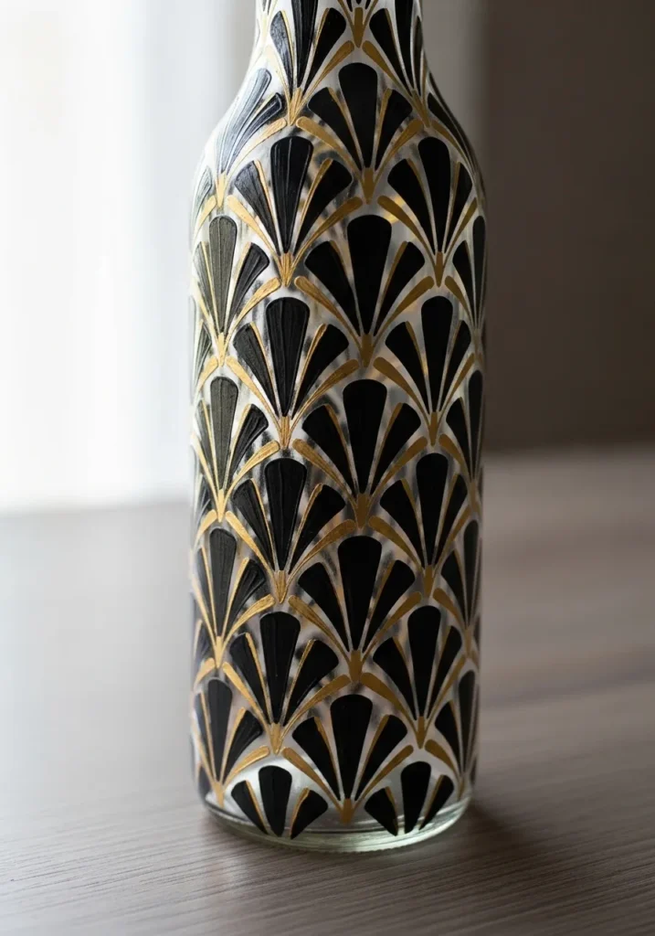 This glass bottle is completely transformed by a striking Art Deco-inspired pattern that covers it from base to neck. The design features rows of black fan shapes meticulously outlined in shimmering metallic gold paint. The contrast between the deep matte black and the reflective gold creates a luxurious and vintage aesthetic that feels incredibly upscale. Each fan is perfectly nested against the next, creating a rhythmic and geometric flow that turns a simple glass vessel into a sophisticated statement piece.