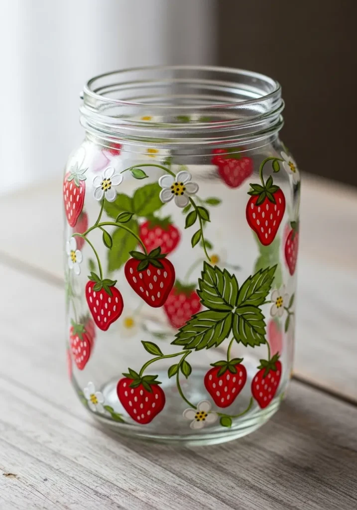 I love how joyful this jar feels. Painting strawberries is simple but the result looks detailed and charming. This kind of design works great for beginners because the shapes are easy to repeat. I can picture using a jar like this for fresh flowers or craft brushes on a desk.